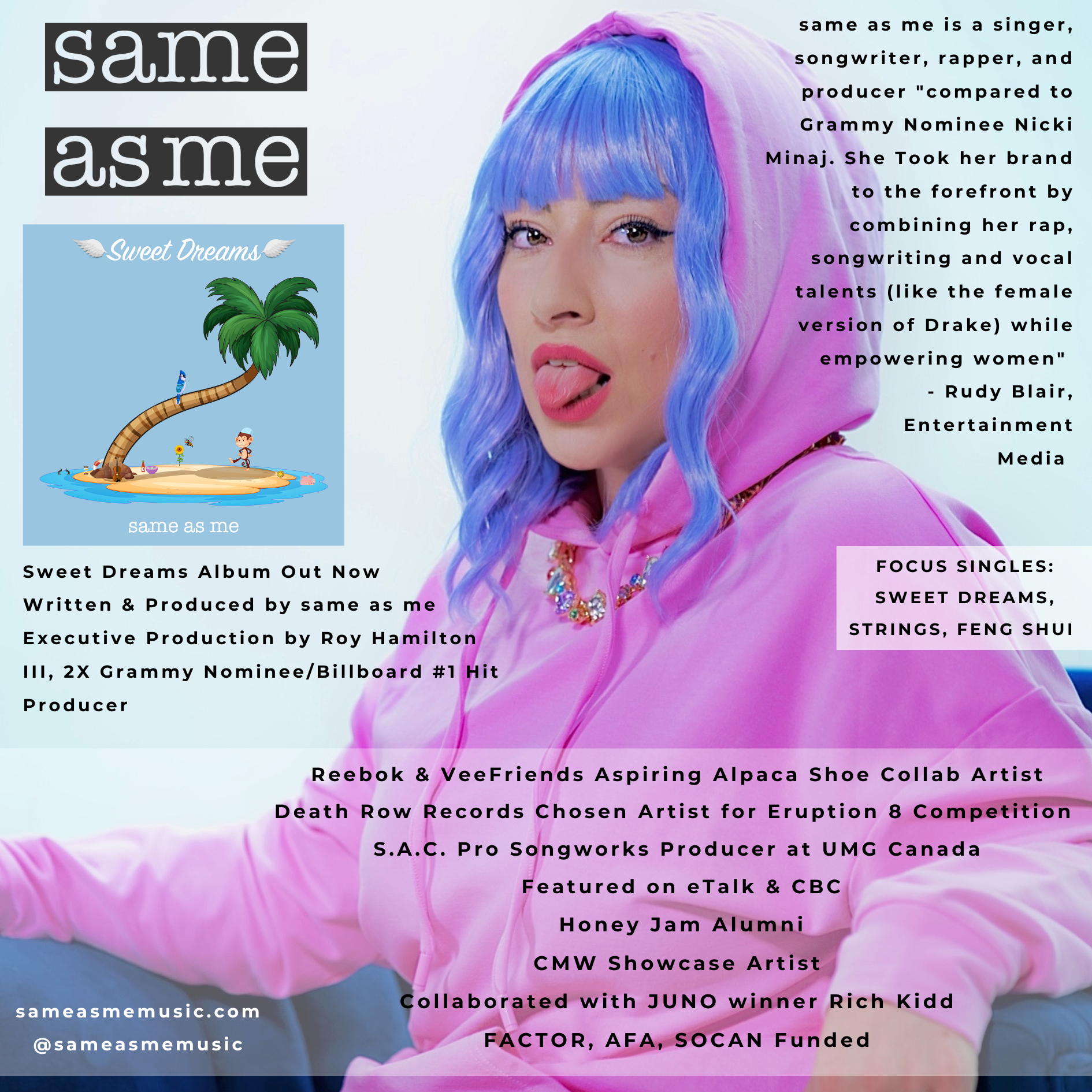 Before her rebrand, same as me has released numerous singles and music videos that harnessed over 100K Youtube views. She also landed a sync deal with Emmy Award-winning company Bunim/Murray (Keeping Up With The Kardashians). Some outlets her music has appeared on are numerous radio stations across Canada such as Toronto's Urban Hit Music Station G98.7 FM, California Music Channel, and OK TV Germany to name a few. same as me has also worked with LA-based Artist Development and Marketing company A&R Worldwide who have helped launch the careers of artists such as Adele and Katy Perry.